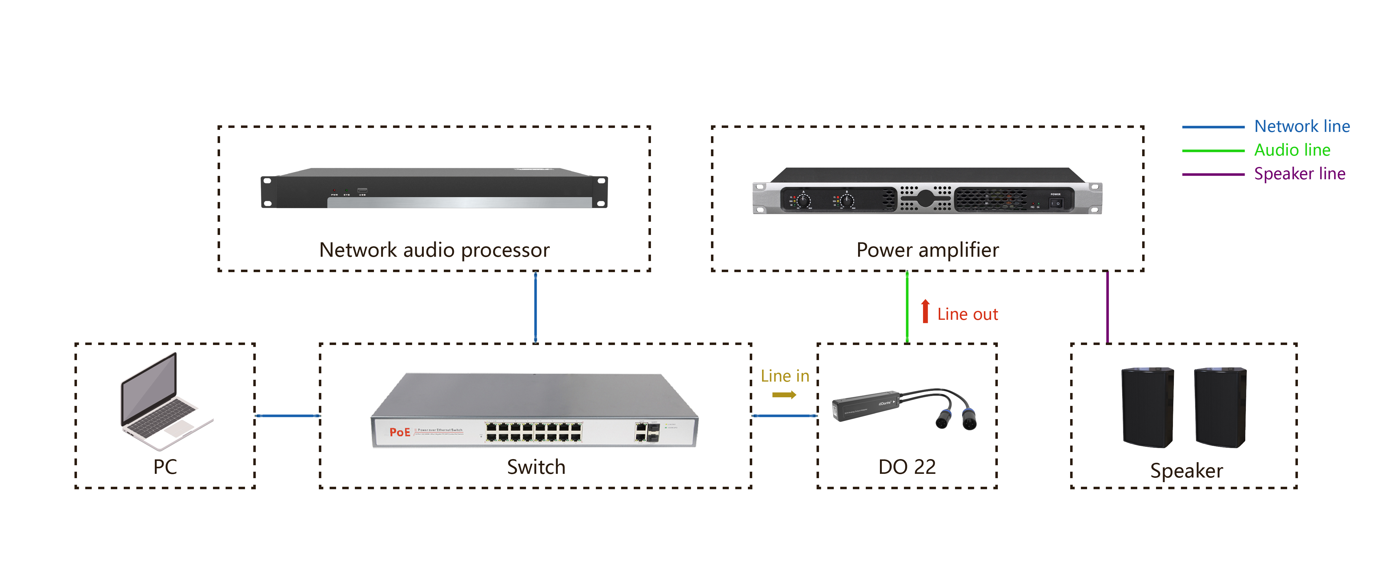 4. Konversi sinyal audio jaringan Dante ke sinyal audio analog untuk output.