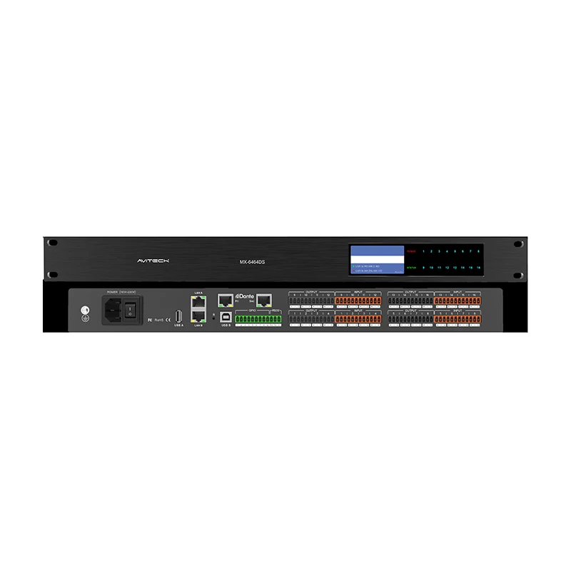 FHBAVTEC® adalah pabrik prosesor audio 3 teratas di Cina. FHBAVTEC® Dante 64 In 64 Out Open Architecture Prosesor Audio Jaringan DSP, kami menyebutnya MX-6464DS. DSP paling kuat di dunia, sebagian orang menyebutnya matriks audio, semuanya sama. FHBAVTEC® Dante 64 In 64 Out Open Architecture Prosesor Audio Jaringan DSP (MX-6464DS) dapat melakukan OEM untuk pelanggan, volume produksi untuk satu model akan menjadi 1000pcs per minggu. Leadtime adalah 10 hari.